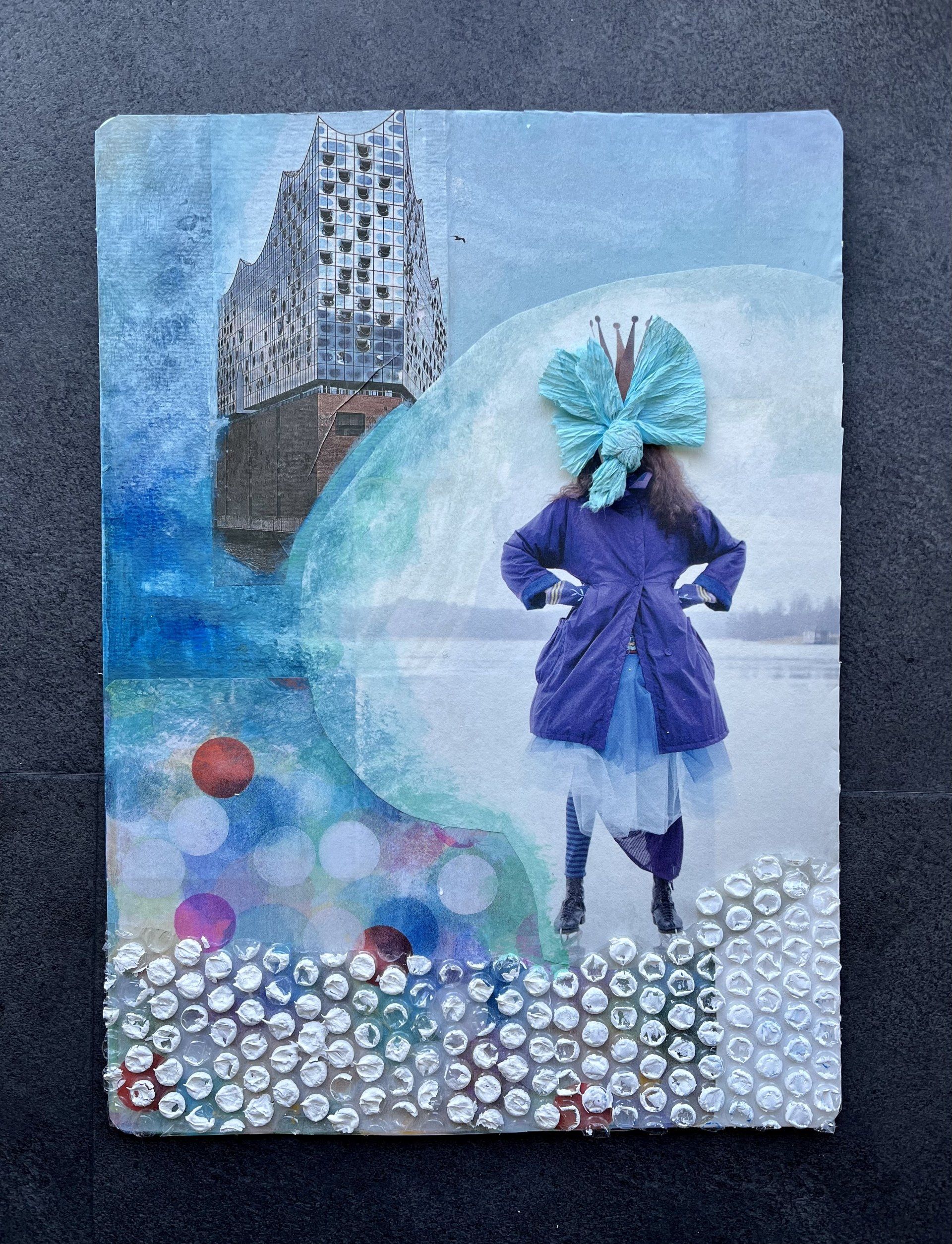 Genauso wie ich das Kombinieren von unterschiedlichen Maltechniken und Farbmedien auf einem Bild spannend finde, inspiriert mich das Zusammenstellen verschiederner Papiere, Bildausschnitte und Collage-Materialien. Die Möglichkeiten sind hierbei fast grenzenlos und ich kann meiner Fantasie freien Lauf lassen. Oft entstehen leicht skurrile oder surreale Bilder.